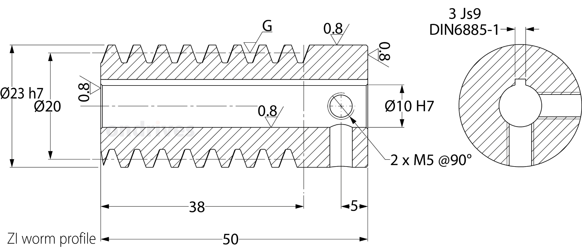 1.5 Module Case Hardened 805M20 (58-62HRC) 1 Start Ground Bore Worm 20° PA Quality Grade 6e25 DIN 3974/3967